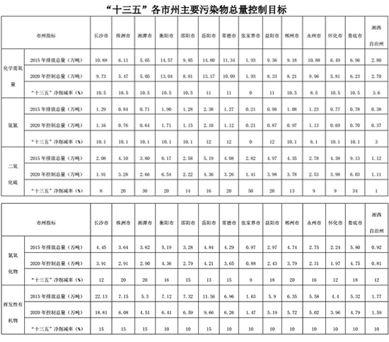 (二)主要目標(biāo)。到2020年,全省萬(wàn)元生產(chǎn)總值能耗比2015年下降16%,能源消費(fèi)總量控制在17849萬(wàn)噸標(biāo)準(zhǔn)煤以?xún)?nèi)。全省化學(xué)需氧量、氨氮、二氧化硫、氮氧化物、揮發(fā)性有機(jī)物排放總量分別控制在108.57萬(wàn)噸、13.58萬(wàn)噸、47.05萬(wàn)噸、42.24萬(wàn)噸、88.45萬(wàn)噸以?xún)?nèi),比2015年分別減少10.1%、10.1%、21%、15%、10%以上。常德市、益陽(yáng)市、岳陽(yáng)市總磷排放量均下降10%以上。