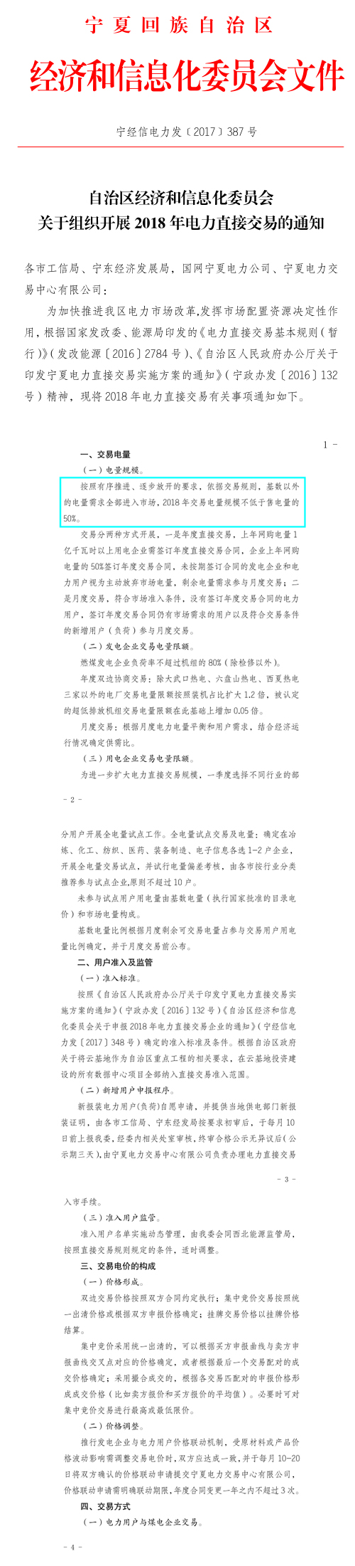 近日,寧夏經(jīng)信委發(fā)布《關(guān)于組織開展2018年電力直接交易的通知》(以下簡(jiǎn)稱“通知”),通知中稱,基數(shù)意外的電量需求全部進(jìn)入市場(chǎng),2018年交易電量不低于售電量的50%。