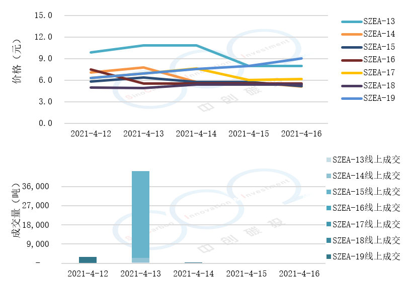 • 線上成交價最低為4.94(產(chǎn)品SZEA-18),最高為10.82元(產(chǎn)品SZEA-13),平均碳價為7.00元(平均碳價為各產(chǎn)品價格加權(quán)得出)。