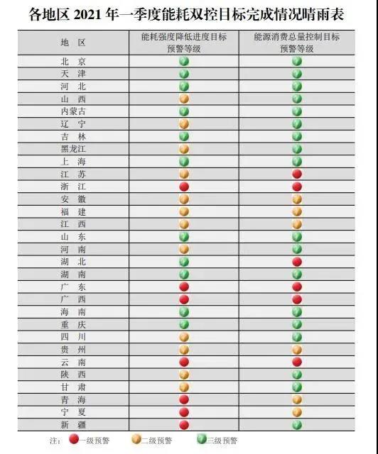 為貫徹落實黨中央、國務(wù)院關(guān)于強化能源消費總量和強度雙控的決策部署,加強能耗雙控形勢分析預警,國家發(fā)展改革研究提出了《各地區(qū)2021年一季度能耗雙控目標完成情況晴雨表》。