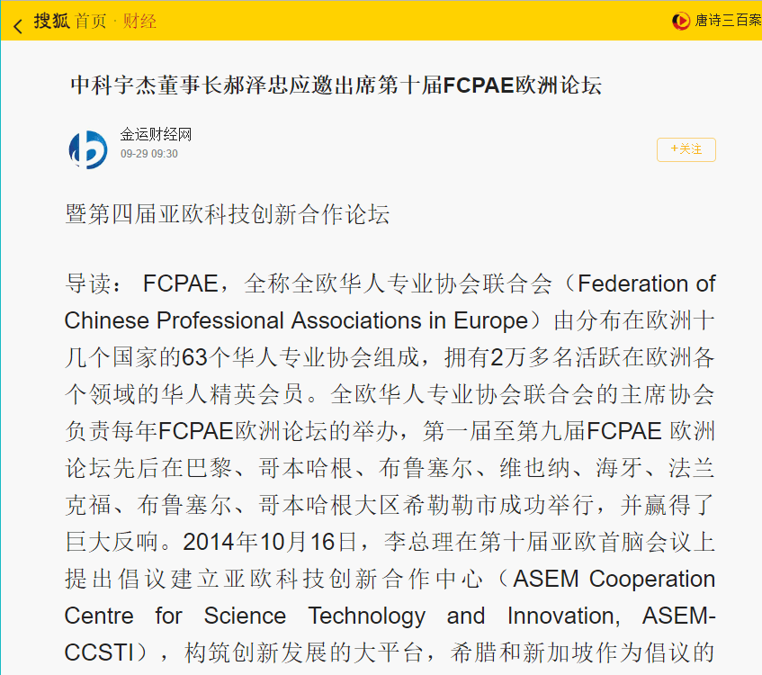 搜狐:中科宇杰應(yīng)邀出席第十屆FCPAE歐洲論壇暨第四屆亞歐科技創(chuàng)新合作論壇