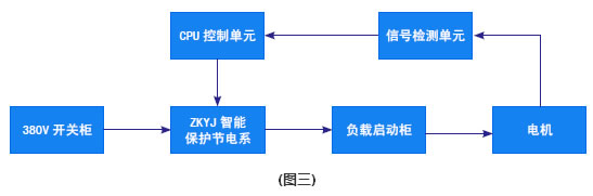 由圖三所示,在低壓380V開關(guān)柜與負(fù)載(風(fēng)機(jī)、水泵、空壓機(jī)、及電機(jī)拖動(dòng)類)啟動(dòng)柜之間串接智能保護(hù)節(jié)電系統(tǒng),系統(tǒng)在電機(jī)的使用上,它能自動(dòng)跟蹤檢測(cè)電機(jī)運(yùn)行中的負(fù)載變化,將檢測(cè)信號(hào)反饋給控制中心,經(jīng)過(guò)中央處理,運(yùn)算放大后給出指令信號(hào),以此來(lái)改變有功電量的輸出,使電機(jī)在最經(jīng)濟(jì)的電耗下運(yùn)行,達(dá)到節(jié)電的目的。